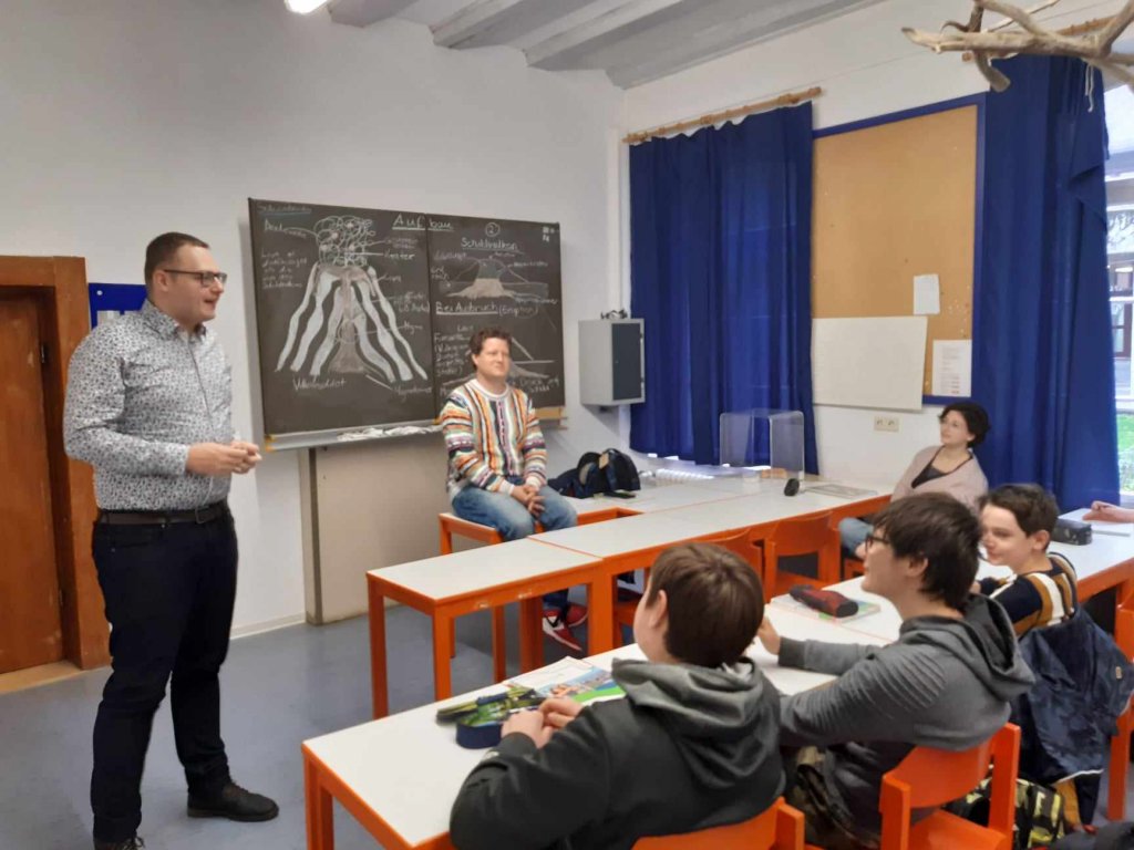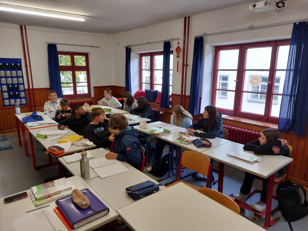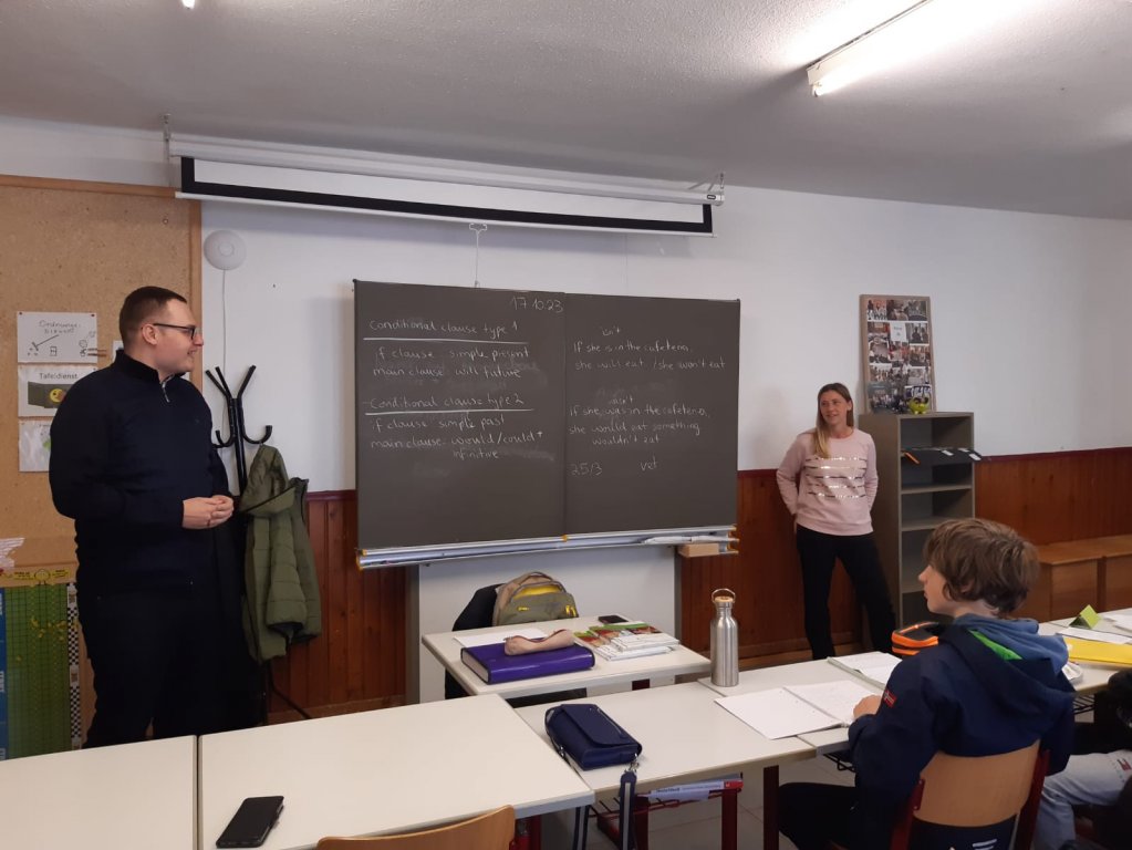 Po obědě nás Oliver vzal do hodiny ekonomiky. Nebyl to původní plán, ale říkali jsme si, že pokud mu to nebude vadit, tak se rádi na tuto hodinu podíváme. Studenty byli chlapci a dívky ve věku cca 16 - 17 let. Sedli jsme si mezi ně a zjistili jsme, že do tohoto předmětu mají knihu i sešit, ale spíše je výuka koncipována na debatách a konkrétních příklad z německé a světové ekonomiky, které se jim Oliver snaží představit, vysvětlit a oni potom o nich diskutují. Studenti byli zpočátku překvapeni, protože normálně mají výuku v němčině, ale Oliverovi nedělalo žádný problém přepnout do angličtiny a samotní studenti se aktivně zapojovali. I když některé body byly vysvětlovány v němčině, to nám ale vůbec nevadilo. Jo, a možná zajímavost, studijní bloky tady mají vždy na 90 minut.